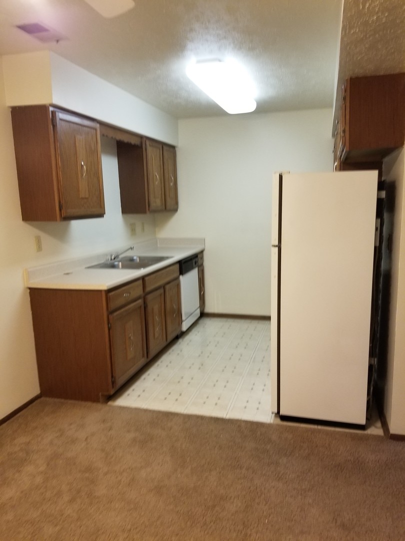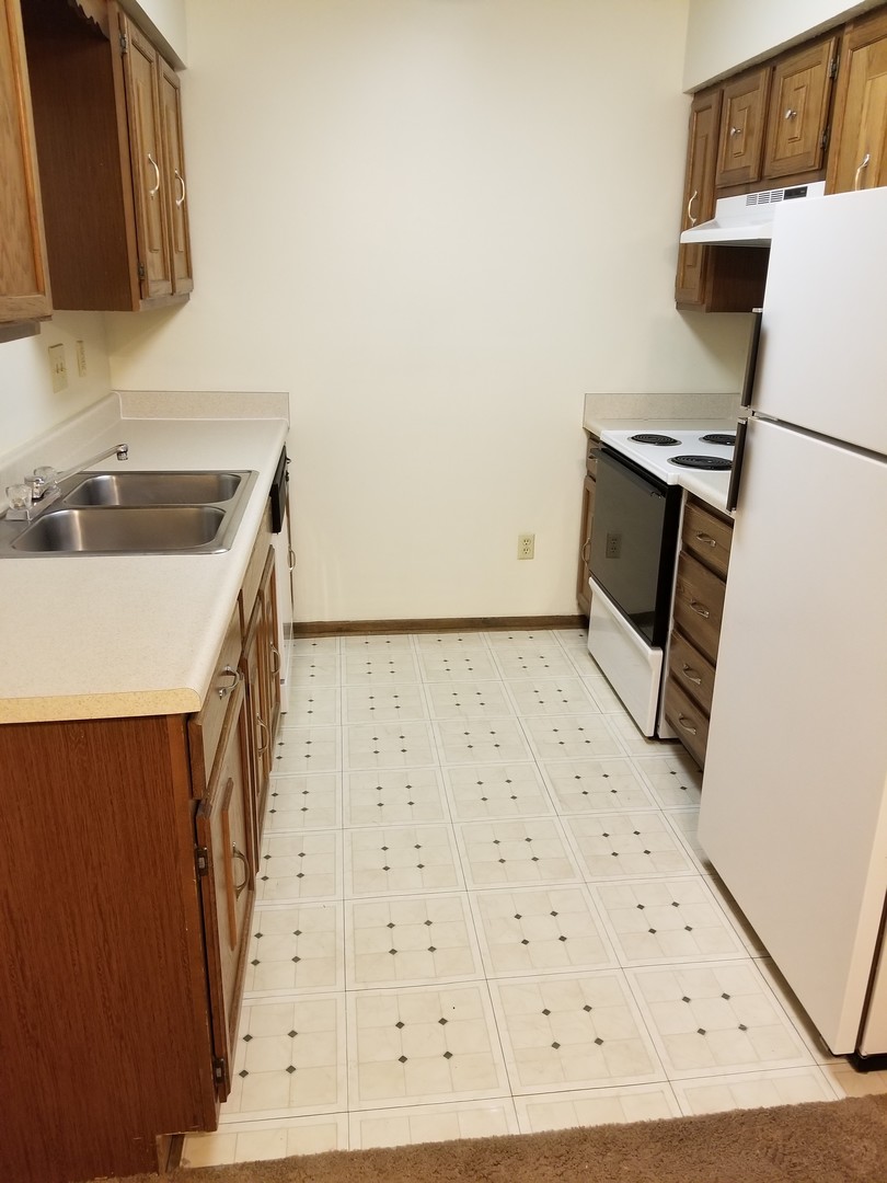 Kitchen has stove, fridge and dishwasher.